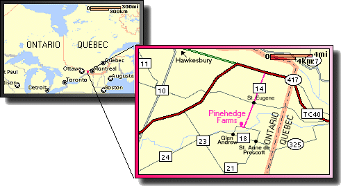 From Ottawa, take highway 417 east to the Barb Road/St. Eugene exit. Turn right and drive into St. Eugene. Take the first right and drive to the flashing stop light. Turn right and look for our sign on the right side of the road. From Montreal, take highway 40 west to the St. Eugene/Chute-au-Blondeau exit, the first in Ontario. Turn left, drive into St. Eugene and at the stop turn left. Immediately after, turn right and drive to the flashing stop light. Turn right and look for our sign on the right side of the road. From Cornwall, take highway 401 to the Lancaster exit. Drive North, past Alexandria to Laggan. Turn right, drive past Dalkeith and take the first left after Dalkeith. At the end of the road turn right and we are on the left side. |